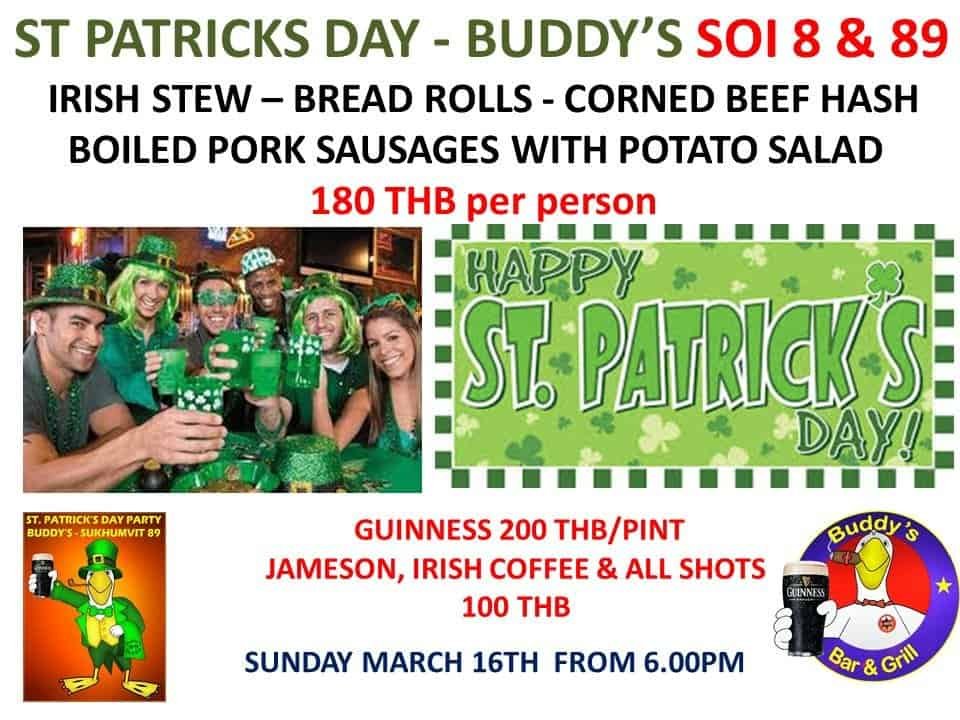 Weโll be turning Buddyโs Soi 8 and Soi 89 Bars green with Irish cheer, traditional food, and, of course, plenty of Guinness, Jameson and all shots at crazy prices!