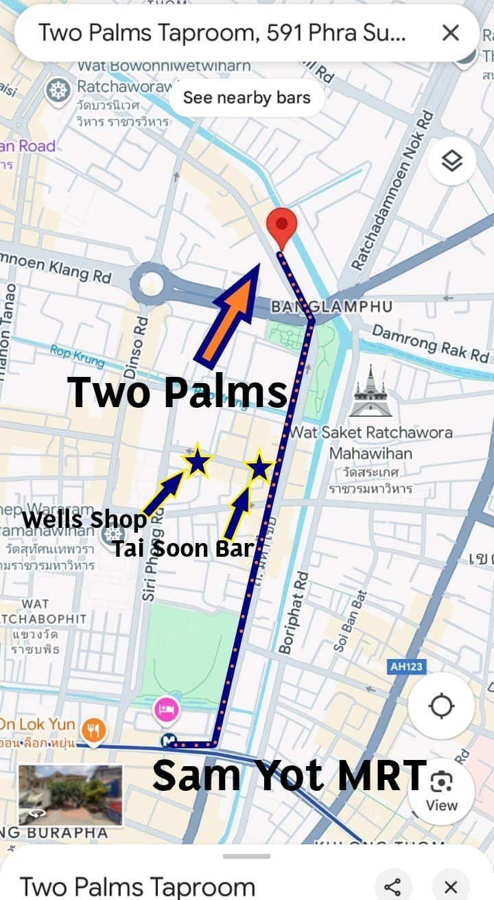 Google map screen short to get to Two Palms Taproom in Bangkok Thailand